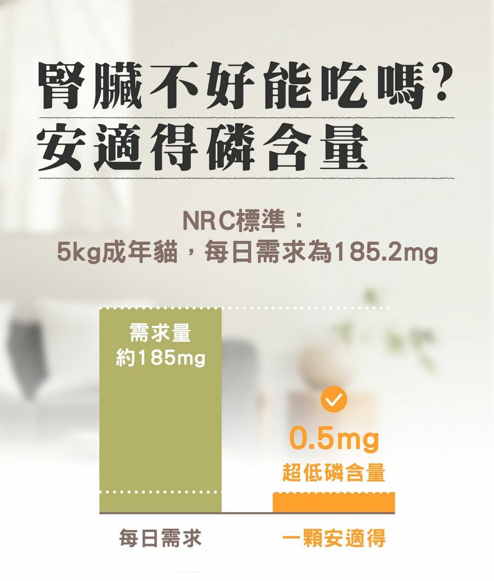 NRC標準:5KG成年貓,每日需求為185.2mgm。1顆安適得=磷含量僅0.5mg,非常低喔!(1000mg=1g)