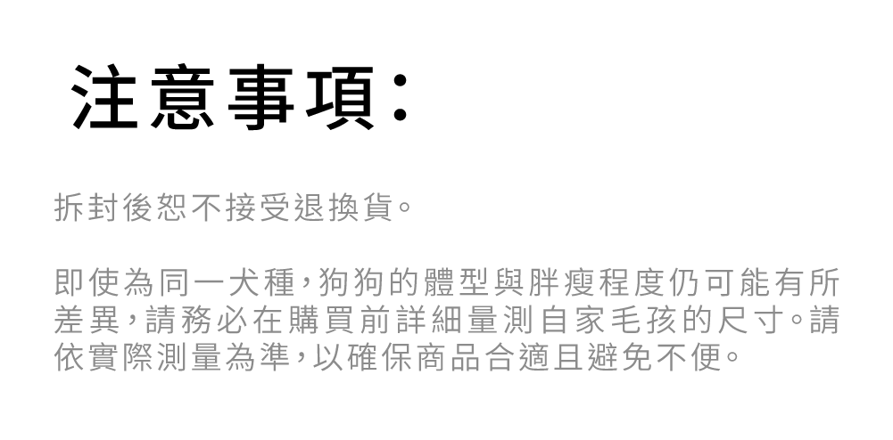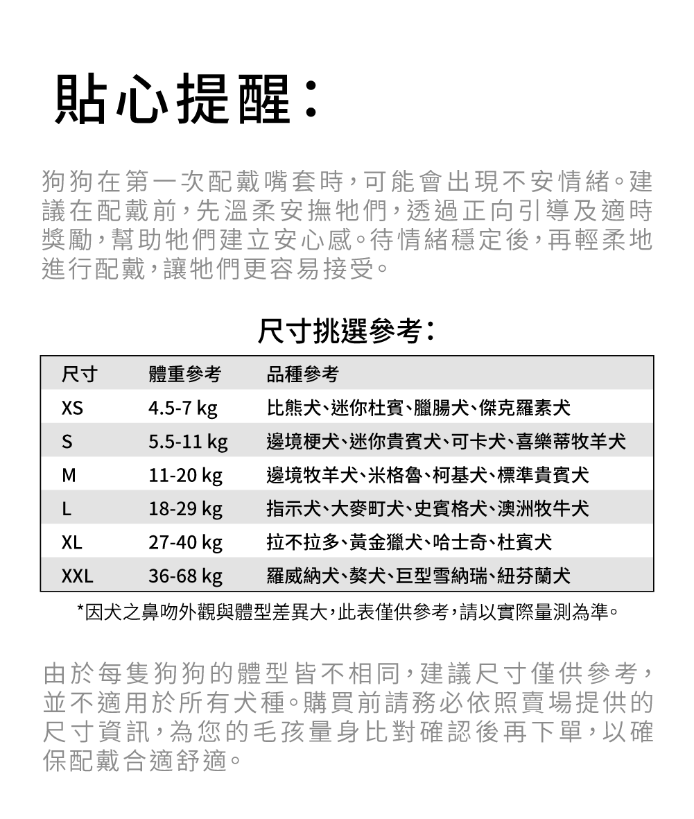 | XXL | 36-68KG | 羅威納犬、獒犬、巨型雪納瑞、紐芬蘭犬 |